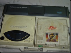 如上圖所示分為三部份 : 右--主機--使用卡式插槽 ; 左--CD-ROM ;基座--Interface Unit 連結左右兩部。拆卸如下圖。遊戲有卡片式及 CD-ROM 兩者通吃 ;又因設計精巧可單獨拆開玩卡片式遊戲 , 及 CD PLAY 使用 。 當時的 〝弁慶外傳 〞如上圖薄薄一片其內容據悉只有 “ 3 Mb ” 但卻花了數十小時破關 ;再前後玩了數次及家人跟玩同樂 , 著實物超所值。 而 CD-ROM 我後來幾乎都當隨身聽使用 ,現在回想起來當初就是看上它可以玩 CD-ROM 的遊戲 ? (這在當年可是創舉) 再者其精緻的設計以今日觀之亦令人激賞心動。 啊 ! 說到我的電玩履歷 : 咖啡廳的投幣遊戲桌--小蜜蜂、敲磚塊.... ; 電腦遊戲最早是使用如 〝錄音帶 〞來載入電腦 , 印象中的遊戲是大名鼎鼎的“ 三國誌 ”。